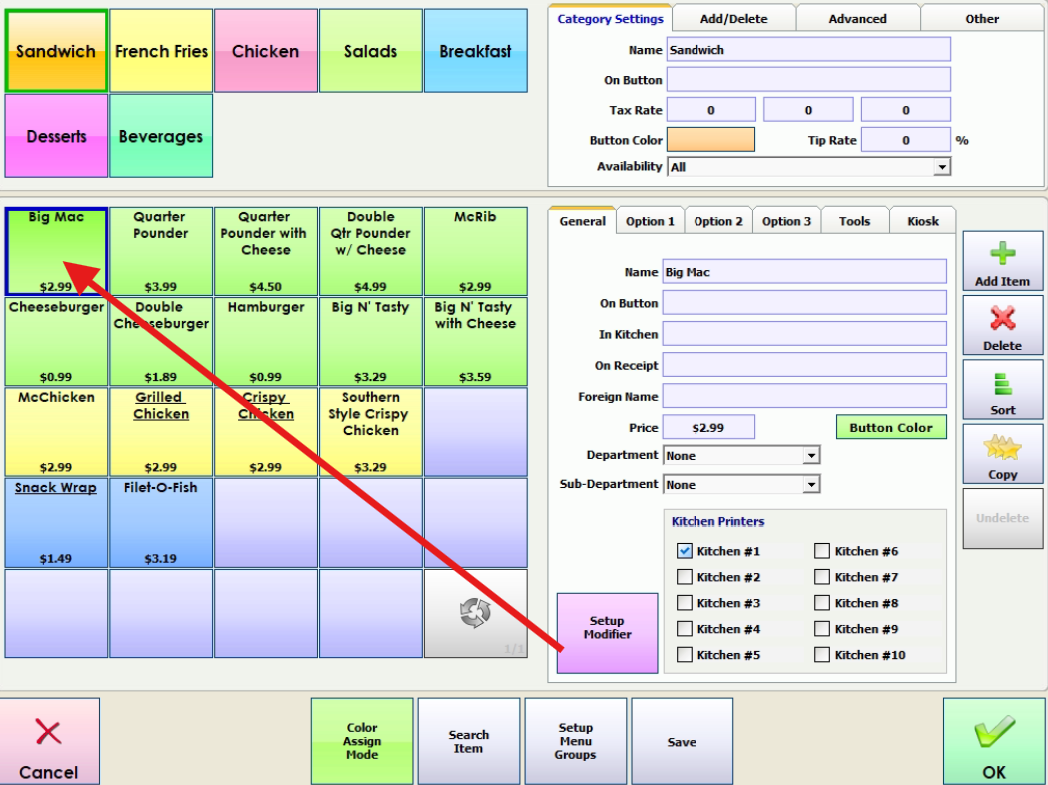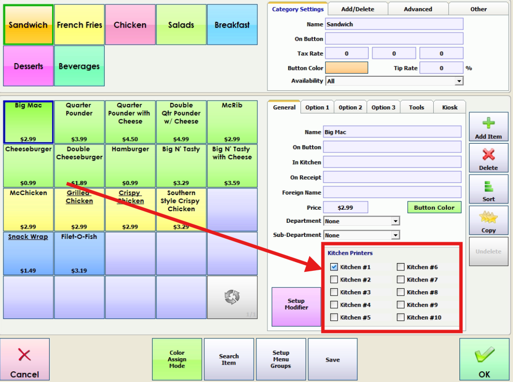 Choose the appropriate kitchen printer for that item from the available printer list.