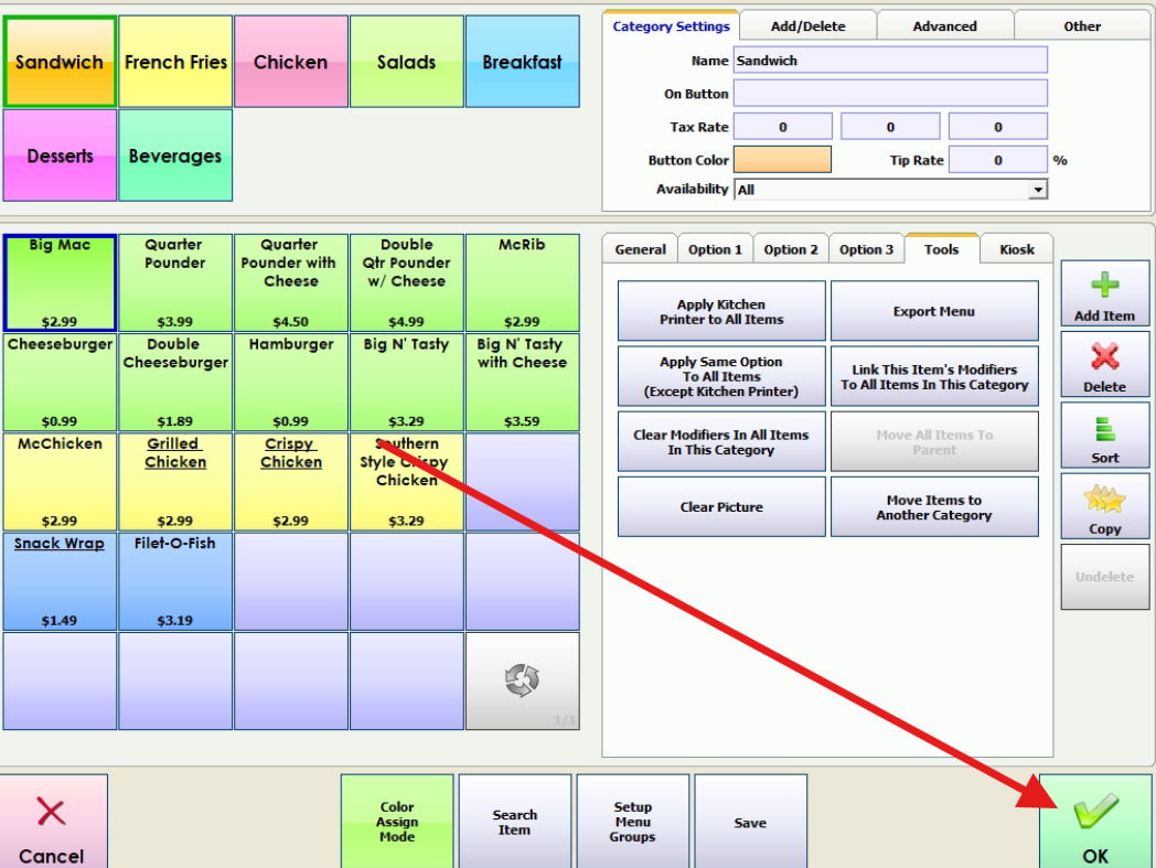 In the Utilities menu, select “Apply Kitchen Printer to All Items” to assign the same printer to every item in the category.